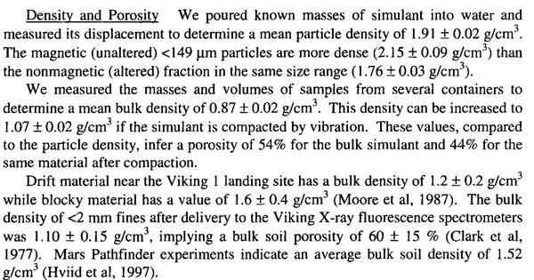 这里给出了至少三个密度:容重(bulk density),震荡密度(姑且这么翻译吧,after vibration),真密度(mean particle),容重就是直接把土壤倒进量筒里,保持了最一般的状态;震荡了以后孔隙度减小,密度会上升一点;丢到水里去就把里面的空气全赶跑了,就是样品粉末的比较真实的密度了。这里题主没说,我们就按照容重来,发现模拟火星壤的容重是 0.87g/ml。