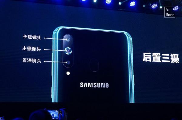 Galaxy A8s 搭载 10nm 制程的高通骁龙 710 处理器,辅以 6 / 8GB+128GB 存储搭配。前置配备 2400 万像素摄像头;后置采用垂直三摄设计,分别为 1000 万像素 F2.4 光圈的长焦镜头、2400 万像素 F1.7 光圈主摄像头、500 万像素景深摄像头。